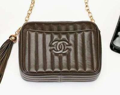 Rectangular with top zip and long leather tassel zipper-pull; vertical quilted stripes and quilted "CC" logo on one side, long gold chain shoulder strap.