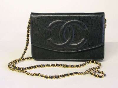 Pebble-textured black calfskin envelope-style clutch purse with optional chain handle; several credit-card and zip slots, large embossed "double-C" logo on front.