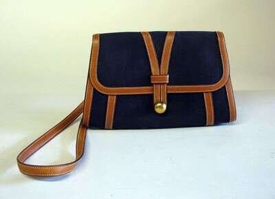 Trapezoidal envelope shape with large brass-button snap clasp and decorative leather strapping around edges and seams, lined in soft kid.