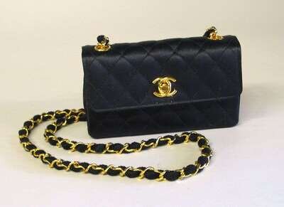 In black satin with long chain handle and turn-lock logo clasp.