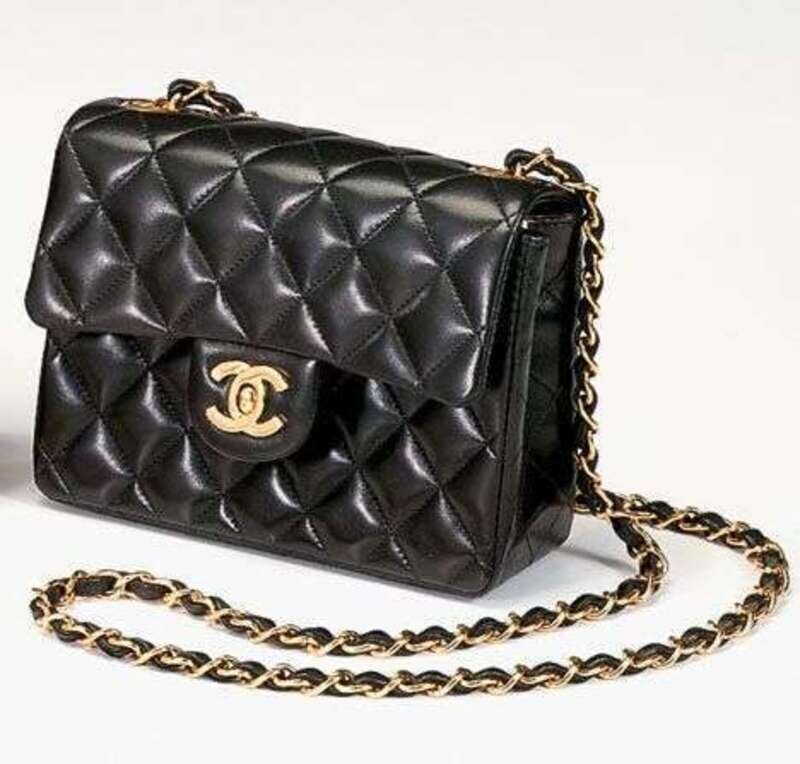 Squarish shape with long chain handle, logo turn-lock clasp on an extended tab at front flap; lined in burgundy leather.