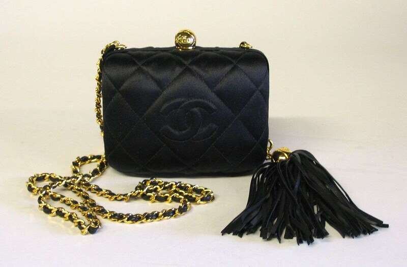 Hard-sided clamshell structure with quilted satin pattern, "double-C" logo on one side, with a long gold and leather-woven chain strap and leather tassel detail; lined in black calfskin.