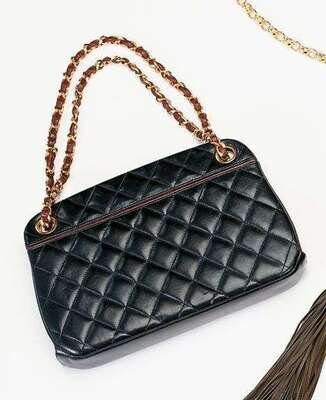 Classic diamond quilting in navy calfskin with burgundy calfskin details and trim, chain handle threaded through large grommets, the inside with multiple compartments, center with clamshell snap closure.