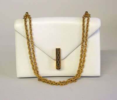 Pure white leather with bright gold hardware; textured chain-link strap and detail at clasp; lined in kid leather.