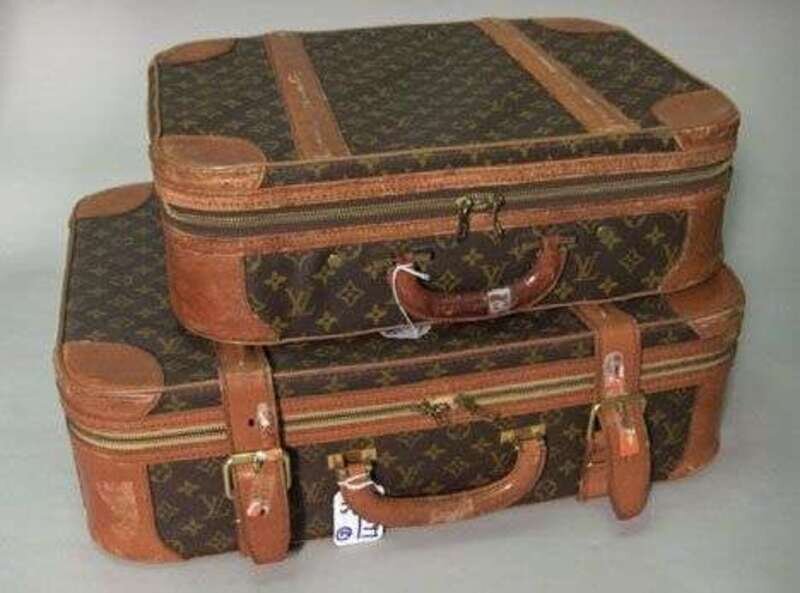 In signature canvas with leather trim and bracing, leather buckled straps on the larger of the two; with muslin lining and interior side pockets.