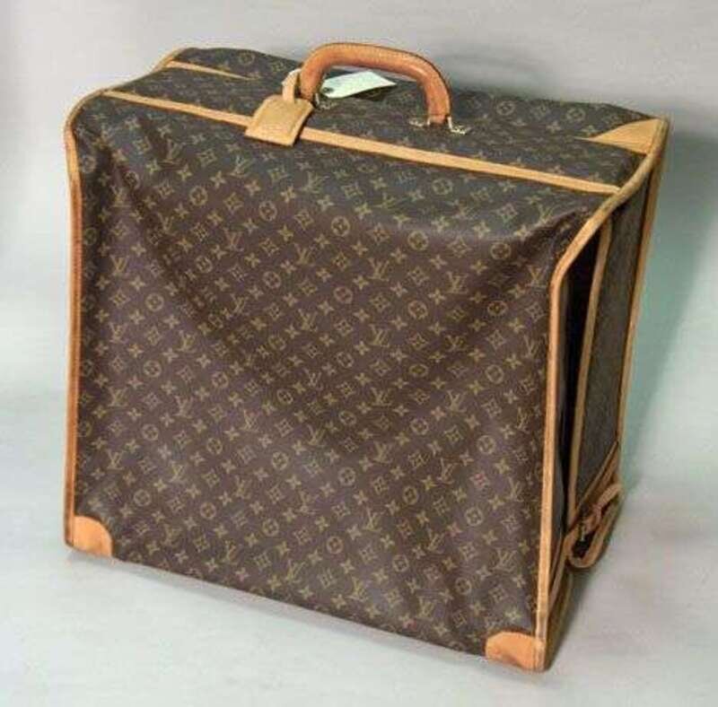 Solid frame soft-sided fold-over garment bag with natural leather trim and details, with a brown nylon multi-compartment interior.