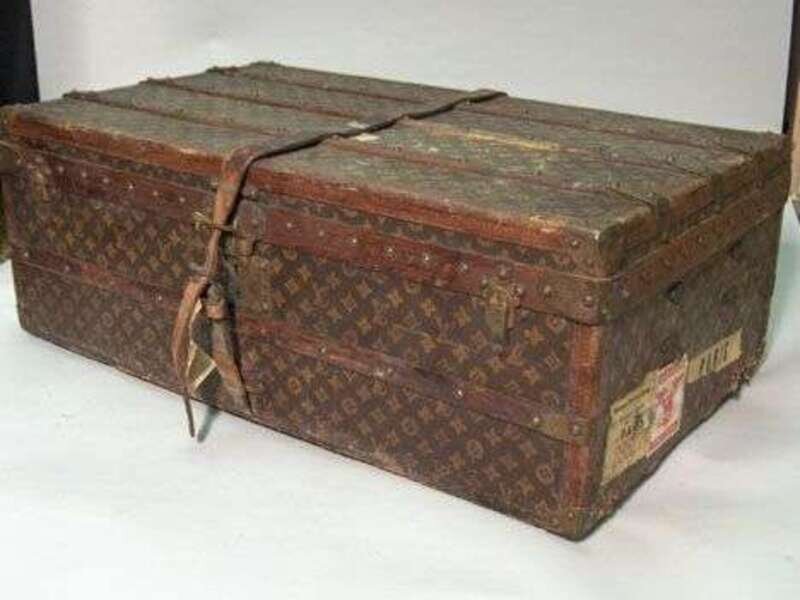 In signature printed canvas with wooden bracing, leather trim, brass hardware, and with a "crown" decal on the side; interior lined in white muslin, with a fitted muslin basket; labeled with serial number 185324.