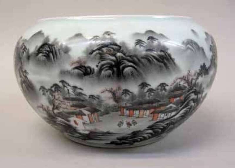 Of ovoid form, the shoulders painted with figures traveling towards a group of huts in a rocky landscape and fishermen on a lake. Signed to base and with seal.