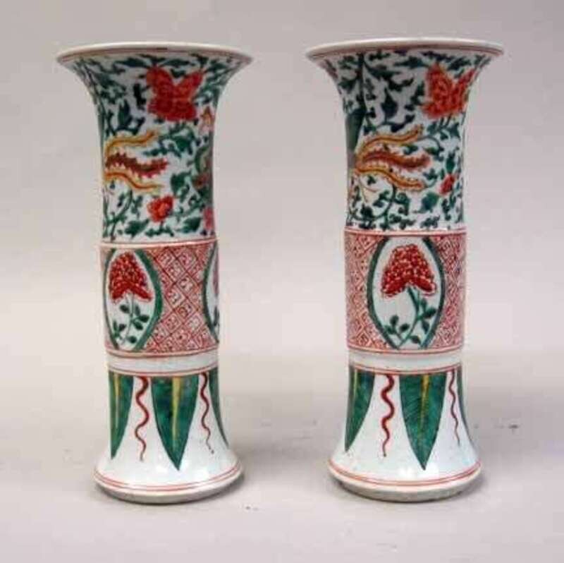 painted with iron red, green and yellow and orange foliate medallions on a diaper ground bordered by an inverted leaf tip band below and phoenix amid flowers above.