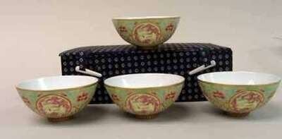 Of rounded form raised on a short foot rim, the exterior enameled with roundels of stylized dragons on a ground of stylized lotus amid green and blue scrolling leaves above a squared scrolling band at the foot, base marked Qianlong.
