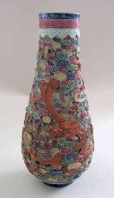 The rim applied with gold gilt, leading to a body depicting a three clawed red dragons, gilded pearls and heavily applied whorl scrolls.