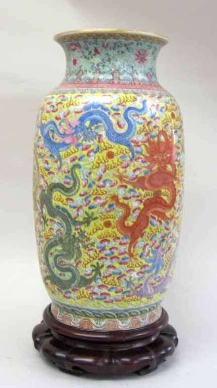 Of baluster form, imperial yellow ground, diaper border to neck, the body enameled in green, red, and blue to show lotus scrolls and dragons chasing flaming pearls, Qinglong Nian Zhi mark to base, on a timber shaped stand.