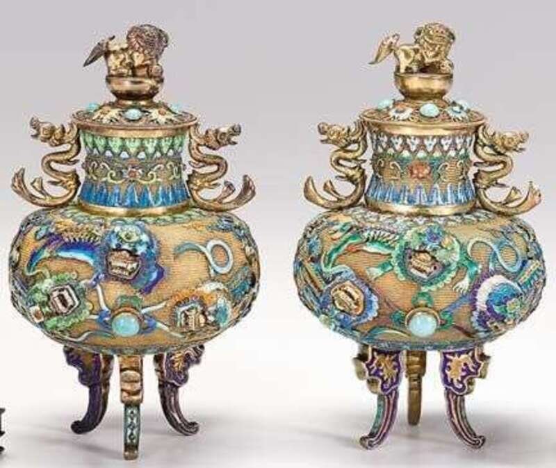 Pair of Chinese silver gilt, 'jeweled' and enamel koros