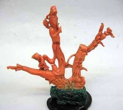 Carved to show a coral dragon supporting a elongated female figure and boy holding flowers, the dragon worked to show scales and a vase supporting flowers, rising from a green jade sea, over a timber base.