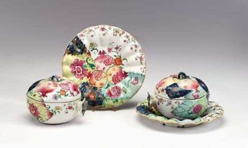 Rare pair of Chinese export Pomegranate 'Tobacco leaf 'soup tureens, covers and stands 18th century, late ch'ien Lung
