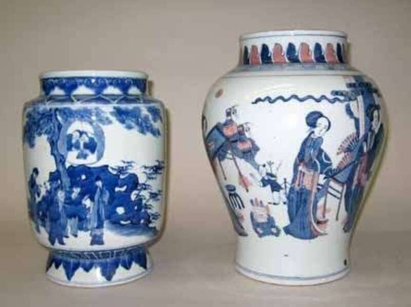 Of baluster form painted with underglaze red with women and children in an exterior, the other of cylindrical form, raised on a high foot painted with figures in a garden the neck with zigzag and cloud collar band.