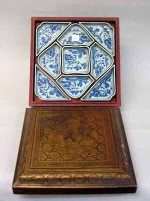 The nine blue and white porcelain dishes worked in the typical canton palette, encased in a gilt box decorated with lotus flowers to the border, with a scholar and boy in a central medallion.