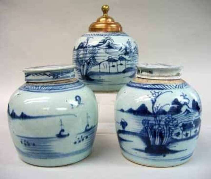Of ovoid form, decorated in the Canton palette, one covered by a turned brass cover with finial (replacement) and the others a flat porcelain cover (3).