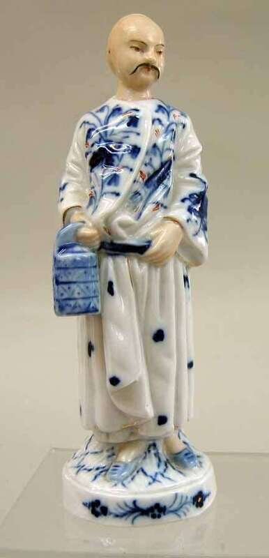The standing Chinese figure, is worked with flesh-tone face, hands and feet, loose robe, with a blue basket in hand.