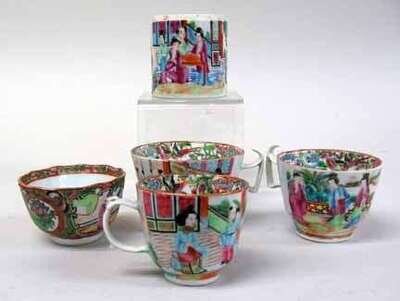 Including a enameled brush pot, and four enameled porcelain cups, each depicting a court scene.