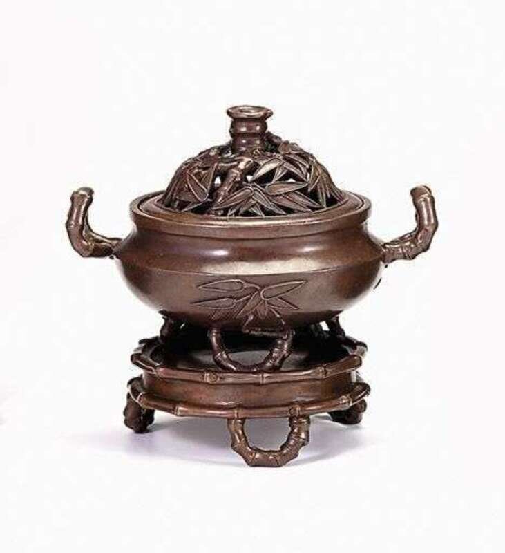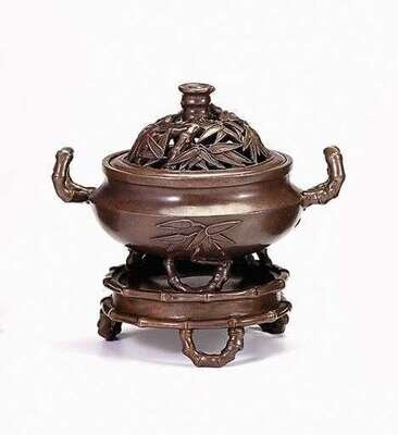 Cast in high relief with scrolled bamboo stalk handles and legs, set on a pierced bamboo motif base and with a pierced bamboo leaf and stalk lid.