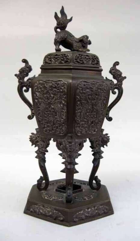 Of Lei form, the cover surmounted by a fu dog, the cover and body decorated in four reverse panels worked in scrolled relief, leading to scrolling masked legs over a rectangular base,.