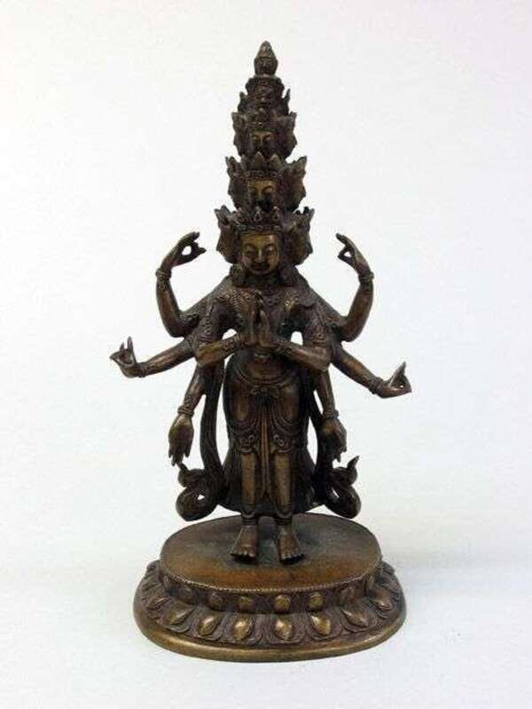 The standing figure is surmounted by a graduating three-headed crown, leading to body with eight extended arms, over a double lotus base.