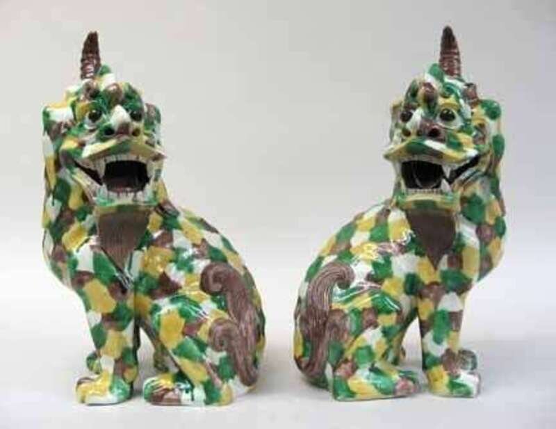 Underglazed with an egg and spinach pattern of green and brown over a white body, the beasts head surmounted with a turned horn, the head and tail adorned with scrolled hair, both seated.