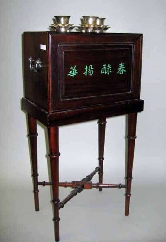 Chinese timber games box, enclosing a Japanese white metal tea service 20th century