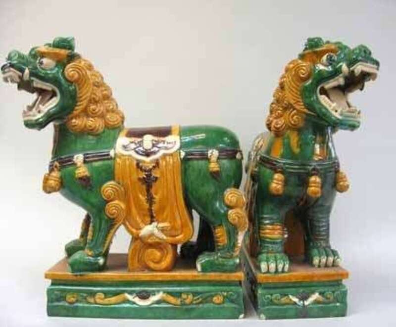 Of typical straw and green underglaze, the figures standing on all fours over rectangular plinth bases.