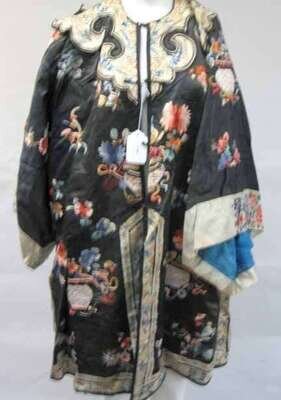 The black silk jacket, silk worked in colors; foliage, and censer with floral sprays, the blue silk pants worked in silk; foliage, and peaches.