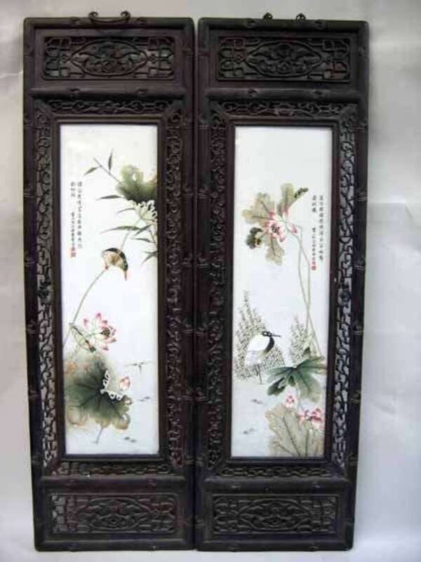Of vertical rectangular form each panel enameled with a bird among blossoming flowers, set into pierced wood frame.