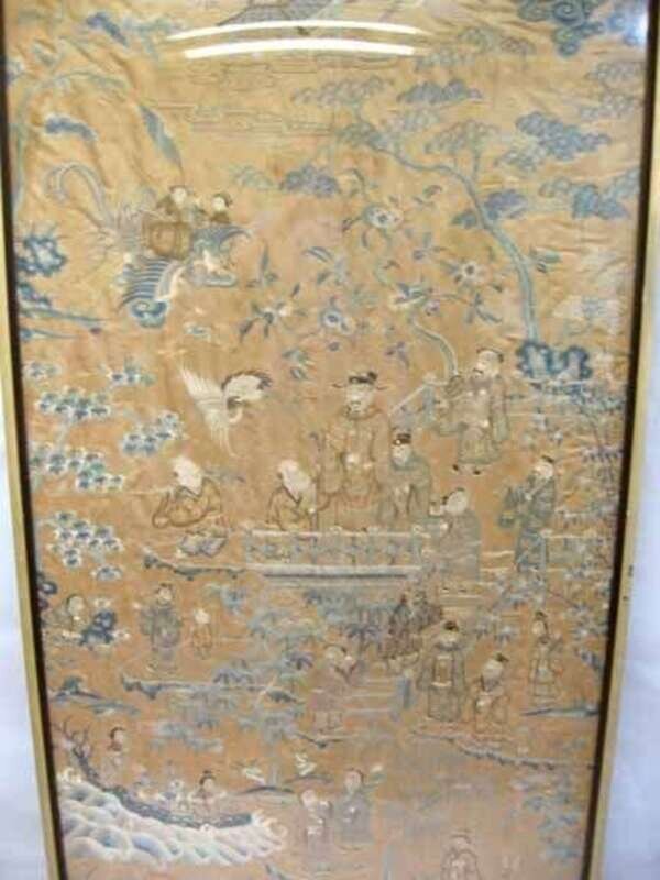 The rectangular panel, embroidery in metallic gold and blue threads, worked to show pale peach trees, Phoenix, cranes, and a court scene of men and boys in the pursuit of pleasure.