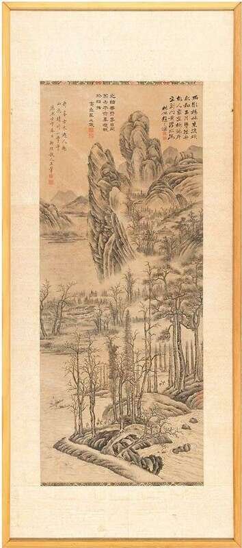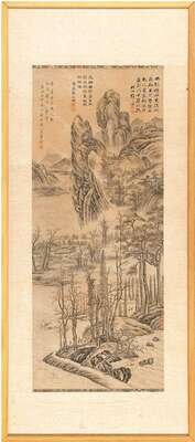 Mounted and framed, ink and color showing a riverscape, with ink inscription.