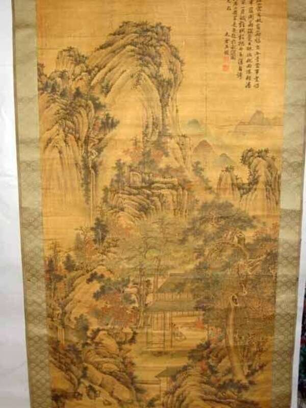 Ink and color on silk, showing a moutainous landscape, with black ink inscription.