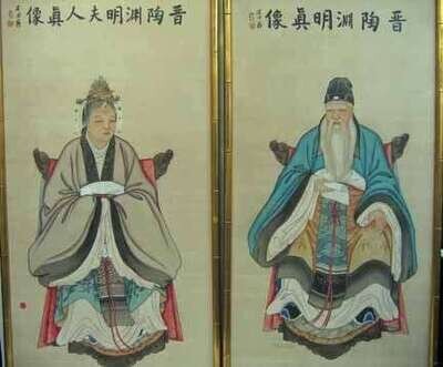 executed in wash on paper, the portrait show elderly male and female figures. Mounted and framed in simulated gilt bamboo.