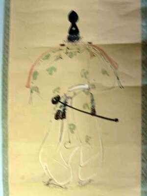 Ink and color on silk and paper, showing Kabuki actors, calligraphy, naturalistic rock-work and two others.