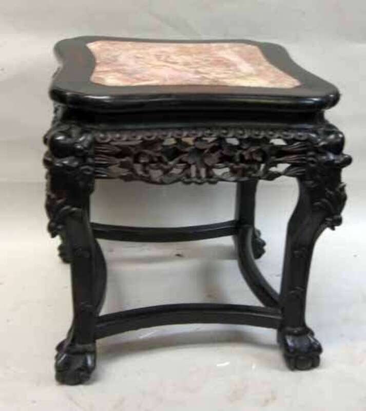 Of square form, with carved and pierced apron below an insert rouge marble top, leading to four carved legs.