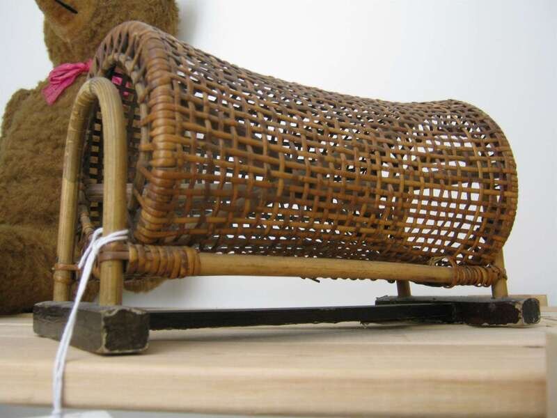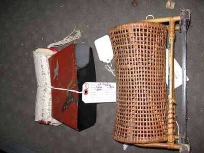 One of printed cloth pillow, over a red lacquered head rest, worked to show a crane, the other a woven cane pillow of cylindrical form, over a timber base.