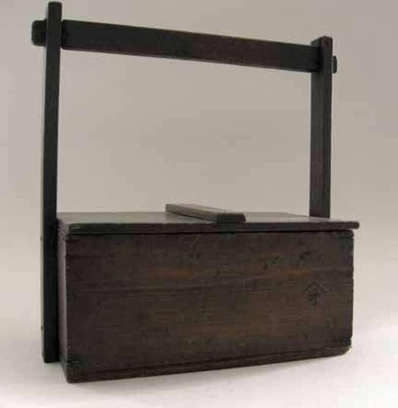 Good patina, the timber box decorated with a single colored Japanese character to the front, a unattached lid sits below a simple plank carry handle.