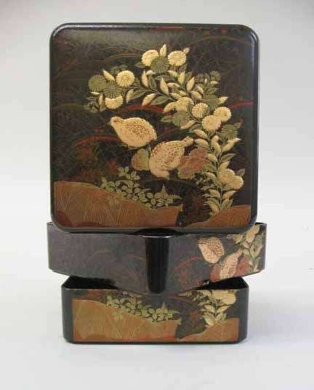 A Sagejubako, the top decorated with a gilded quail and foliate sprays, the sides and front with gilded border, the box divides into three equally sized compartments.