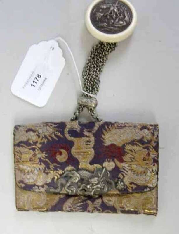 The embroidery silk tabakoire showing dragons, with a white metal dragon clasp, attached by white metal suspension chains to Kagamibuta with ivory bowl and metal disc depicting dragon.