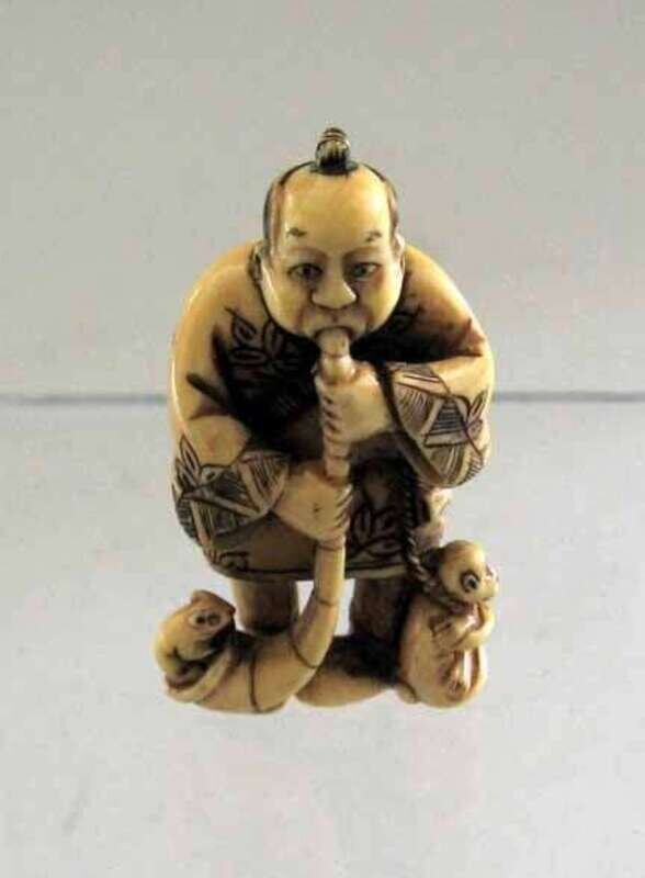 Worked to show a street peddler, with his monkey and a mouse upon his toe. Signed to base.