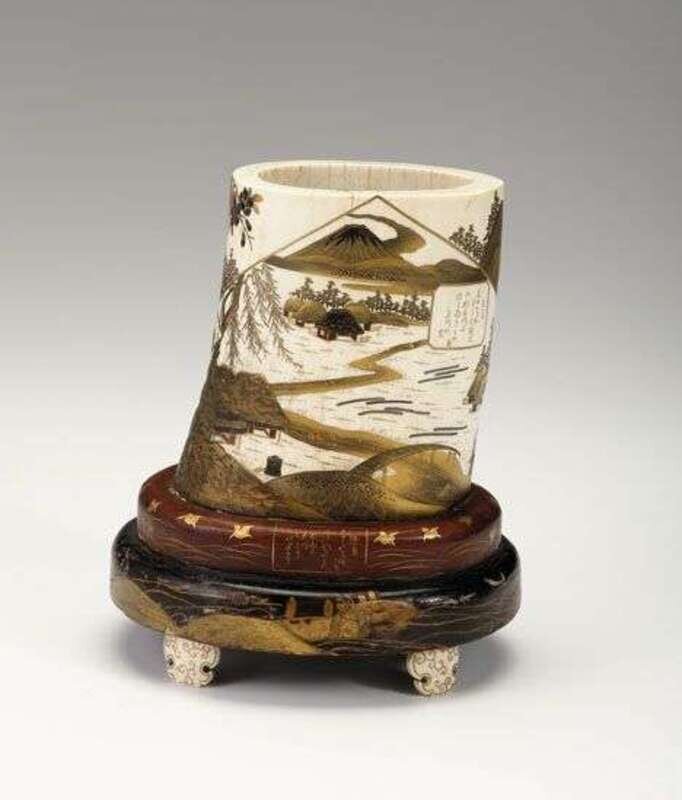 Good period ivory, worked with gilt and black lacquer showing a village below a volcano, on a gold inlay and a lacquer and ivory stand. Both the carving and stand signed.