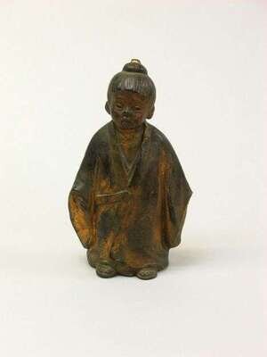 The young boy is draped in a loose fitting kimono, his hair tied in a top knot, some wear to gilding and some minor losses.