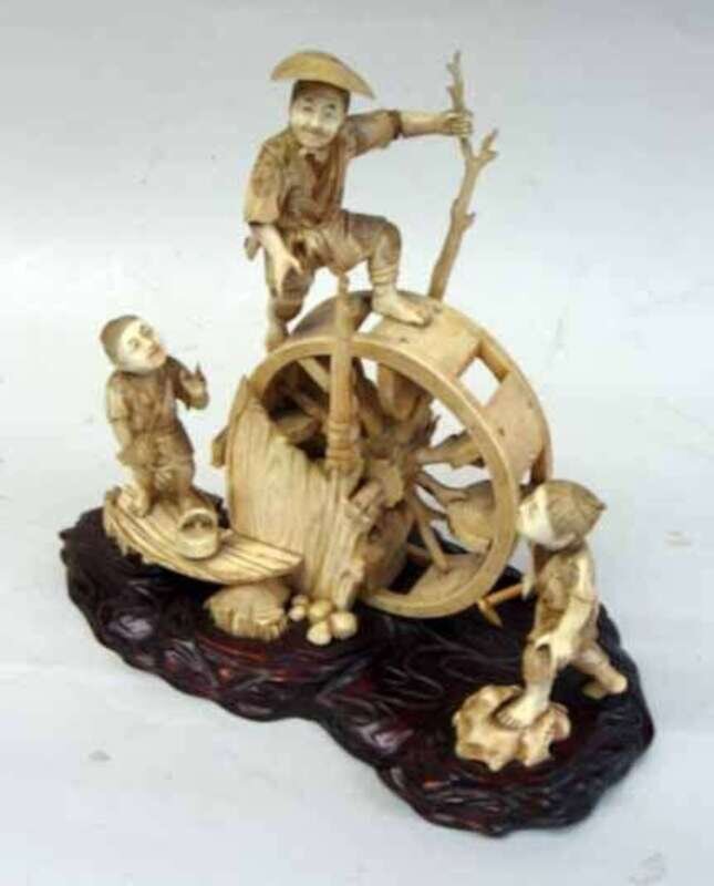 worked to show a adult male figure atop a water mill, assisted by two attendant boys on a timber base.