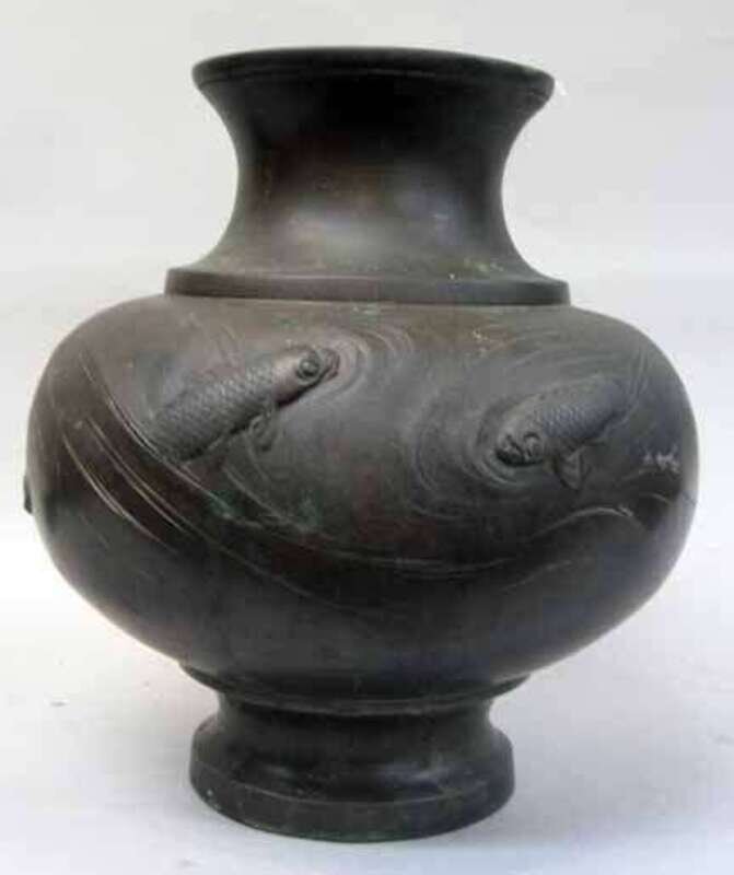 Of ovoid form, the tapering neck leads to a shortened ovoid body worked to show carp at play in a pond, over a conforming tapering circular foot.