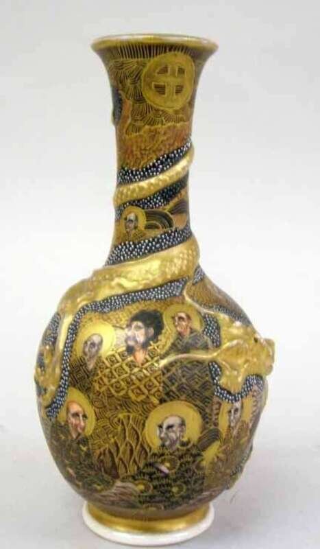 Of tapering ovoid form, the body worked in relief to show a dragon, and painted to show a court scene.
