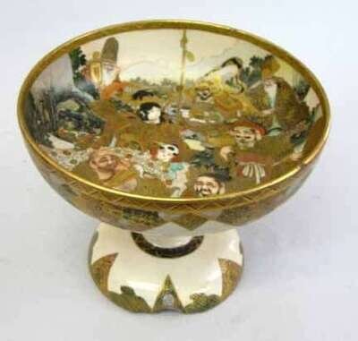 The circular dish sits a top a tapering column over a shaped circular base, decorated in the typical palette showing court officials.