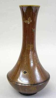 Of tapering form, with a long neck to ovoid body, brown ground painted with gilt and turquoise to show dragonflies and beetles.